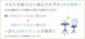 | 初回特典 | 合計最大7,700円分無料 (新規会員登録で2,000ポイント付与、 ポイント購入+初回鑑定+合言葉入力で最大1,500ポイント付与、 初回ポイント購入時のキャンペーン利用で最大3,000ポイント付与、 インスピLINE公式アカウントを友達追加で500ポイント付与 )※1ポイント=1.1円分 |