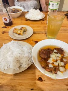 ハノイの名物で、フォーの平たい麺と違ってそうめんのような極細の米粉の麺が使われています。炭火で焼いた豚肉や肉団子が入った甘酸っぱいスープに、その麺をつけて食べます。お好みでハーブや唐辛子を追加したり、揚げ春巻きと一緒に食べることもあります。