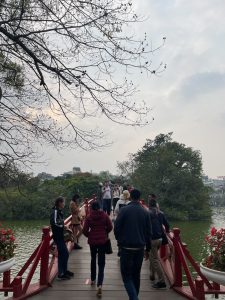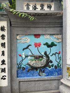 15世紀に亀がもたらした神剣で、中国明軍を打ち破ったとして有名な場所となっています。湖の名前であるホアンキエムとは「還剣」を意味し、神剣を亀を使者に竜王に返したことを示しています。入り口にある亀の碑には、大きな剣を抱えて湖に帰っていく姿が描かれています。