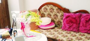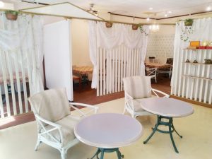 藍先生のサロンは、ゆいレール「牧志駅」から徒歩10分、バスで約5分。酒店やBARが入ったビルの402号室で、ピンクのインテリアやお花が印象的な可愛らしい雰囲気に設えられたサロンです。女性が少しでも生きやすく、楽しく過ごせるようにと気を配っている先生の配慮が感じられますね。
