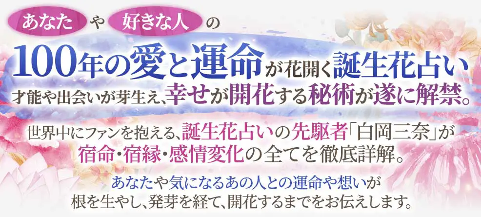 花占いの新解釈「誕生花」。あなたの運命が開花する、幸せの秘術が遂に解禁。生年月日から導き出される、あなたの心に宿る花を導き出し、持って生まれた運勢や性質、数年後の未来まで丁寧に解説いたします。あなただけに秘められた花が伝えてくれる「特別なメッセージ」。この鑑定で余すところなくお伝えいたします。