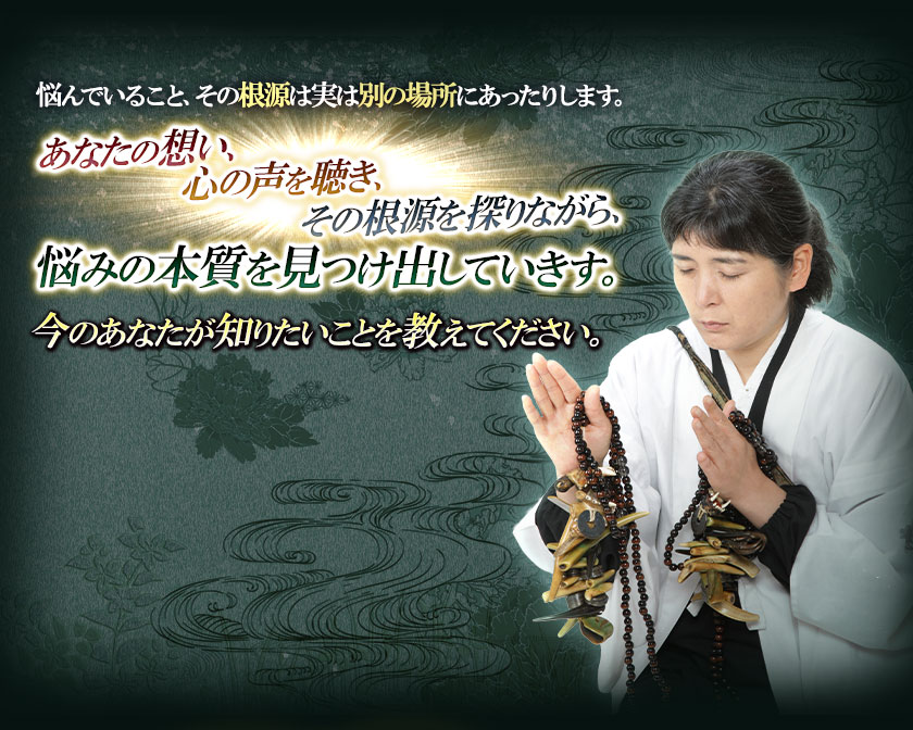 イタコの仕事は、魂の声を聴き、その声を届けることです。あなたが今置かれた状況や心情を踏まえ、その声を聴きながら、あなたについて理解を深めていくことで、今悩みを抱えていることであったり、不安な気持ちであったり、そういったものの根源にある原因を探り出していくことができます。自分自身では気付くことのできない“事実”を浮き彫りにし、あなたがここから一歩を踏み出す力を授けていきましょう。
