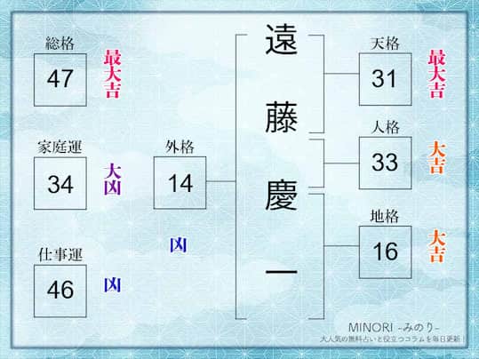 姓名判断において「47画」は、花が開くような輝かしい幸福と吉兆に溢れた大吉数です。そのため「47画」を持つ人は、あらゆる幸運に恵まれていて、子孫にも長く幸福をもたらす吉運を持っているとされています。
