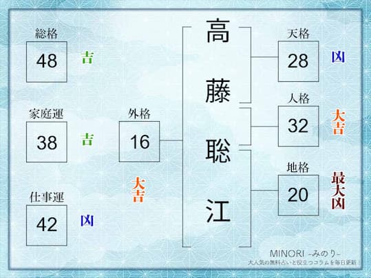 姓名判断において「48画」は、知性と才能に恵まれ、どんな目的も成就させる強運に恵まれた大吉数です。そして「48画」を持つ人は、地位や名誉など吉祥を成し遂げ、威厳や人望を集めることもできる吉運を持っているとされています。