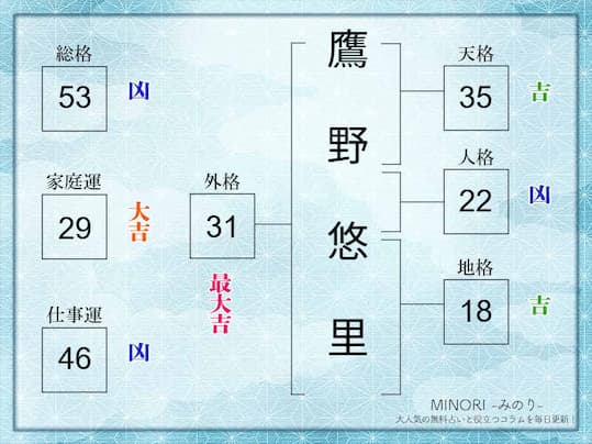 また、人生前半は吉運に恵まれ、後半の人生で苦労が多い運勢の画数とも言われています。運勢の浮き沈みが激しいので、若いうちになんでも好調だからと気を抜くと、年を重ねてからの人生はとても大変なものになる可能性があります。