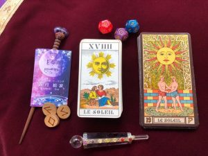 | 占術 | タロットカード、ジオマンシー、ルノルマンカード、ルーン、数秘術、手相、占星術、アストロダイスなど | ||