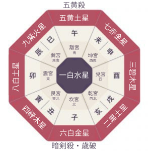 暗剣殺(あんけんさつ)は、五黄土星の反対の方角のことです。この方位で新築、移転、造作を行うと、財産や健康が阻害されるとされています。